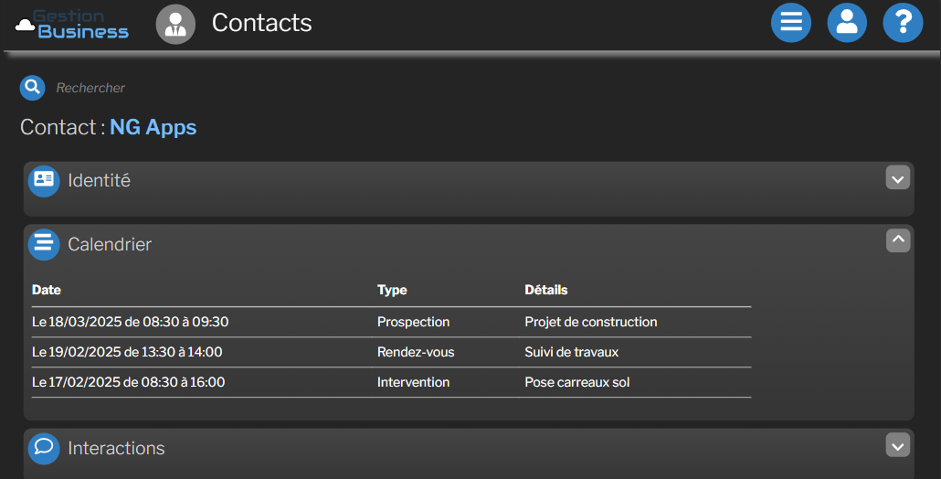 • La fiche contact résume les événements passés et à venir pour le contact en question