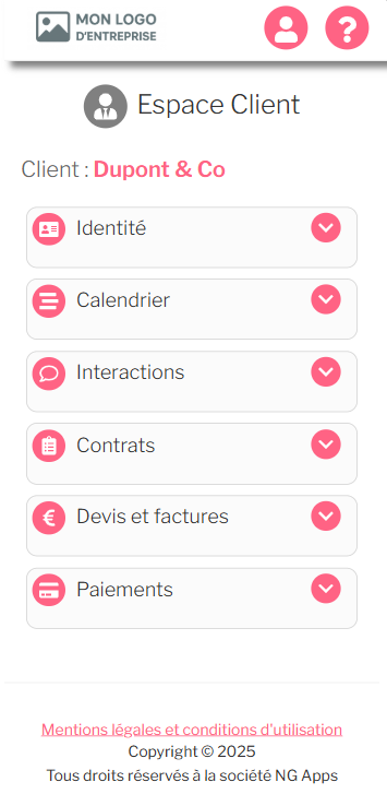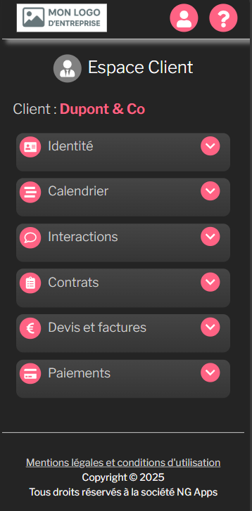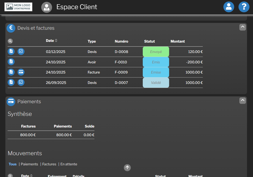 - Depuis son espace, votre client peut consulter la liste de ses contrats, télécharger ses devis et factures, et visualiser son historique de paiement
