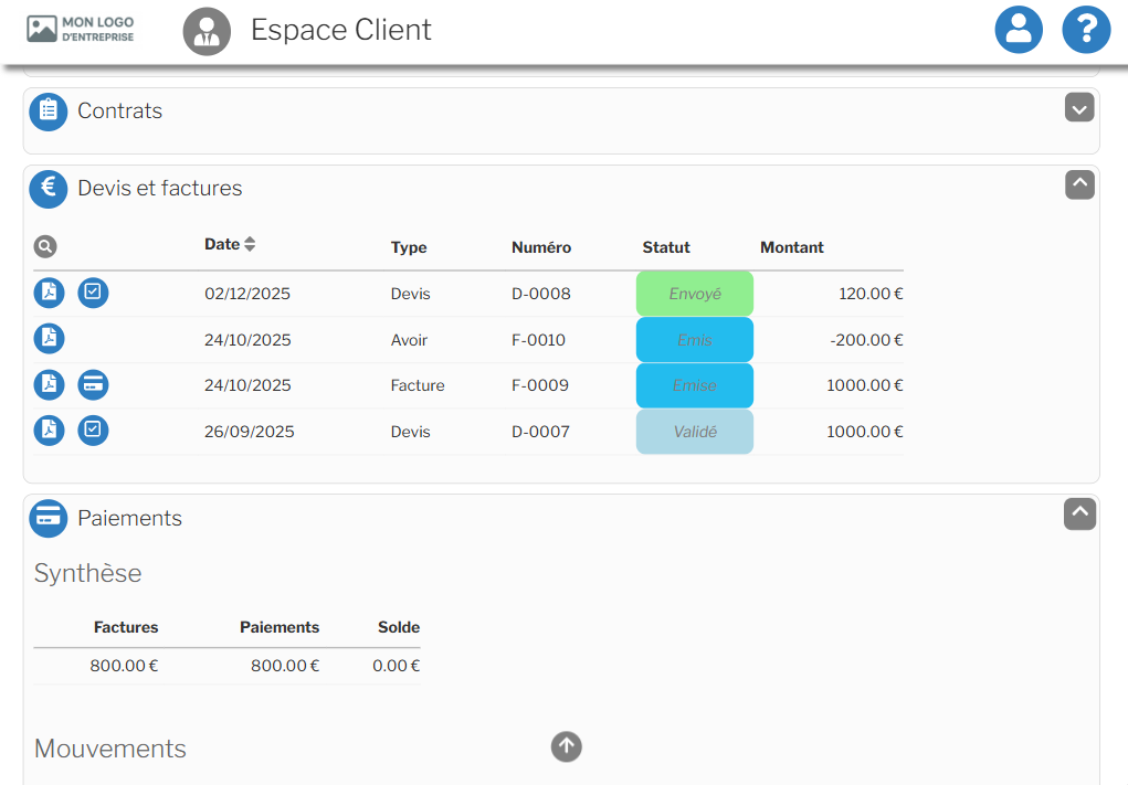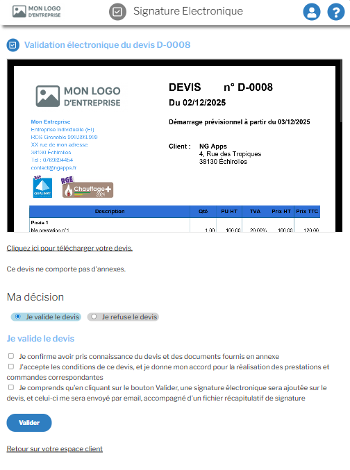 Lors de l’envoi par email d’un devis, un lien de signature électronique est ajouté automatiquement, et il est également accessible depuis l’espace client
