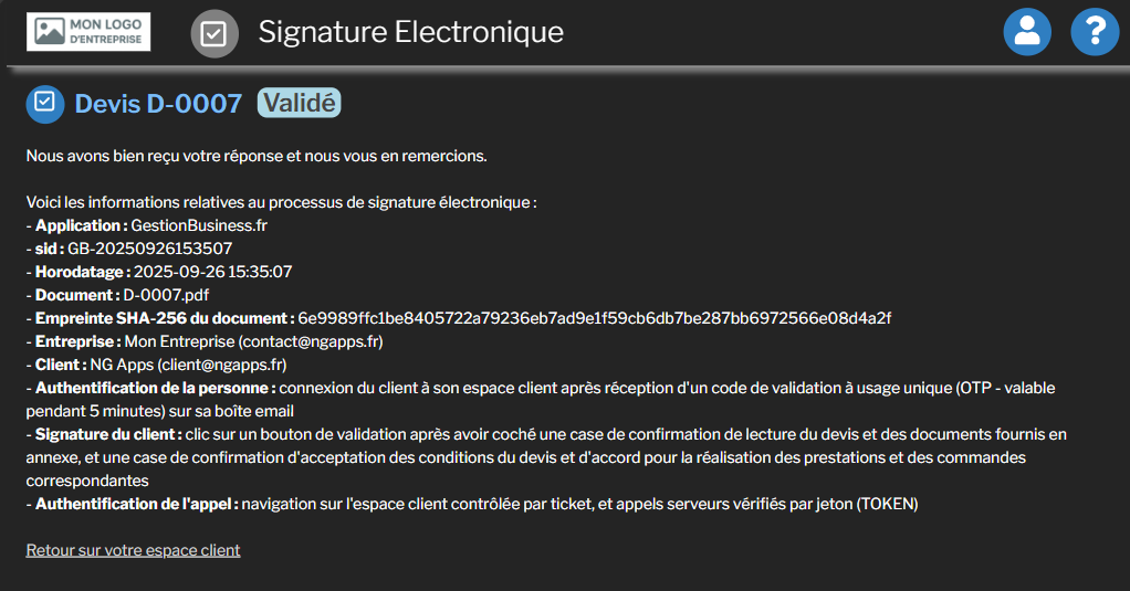 Fichier de preuve : un fichier de preuve est créé et archivé, contenant le nom de l’application, l’identifiant de signature, l’horodatage, l’empreinte numérique du document (SHA-256), le nom du document, les noms et emails de l’entreprise et du client, et la description du mécanisme d’authentification, de consentement et de signature